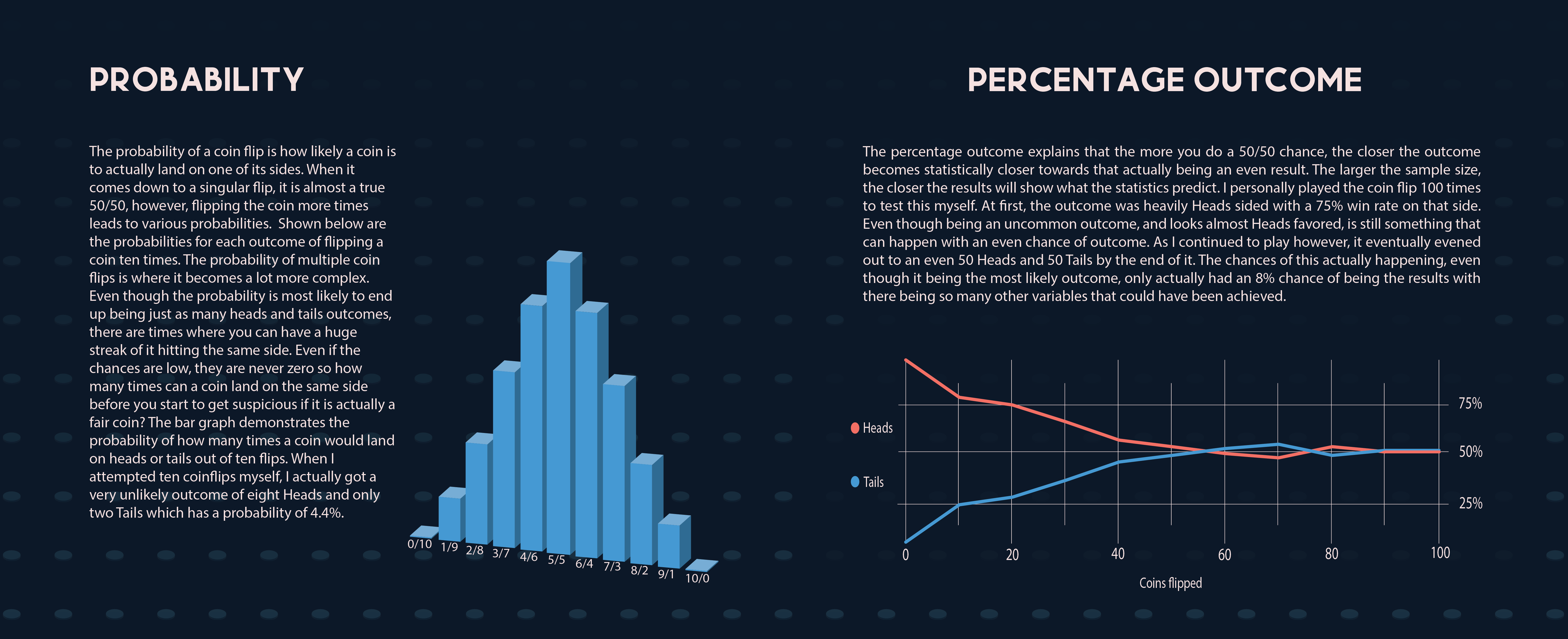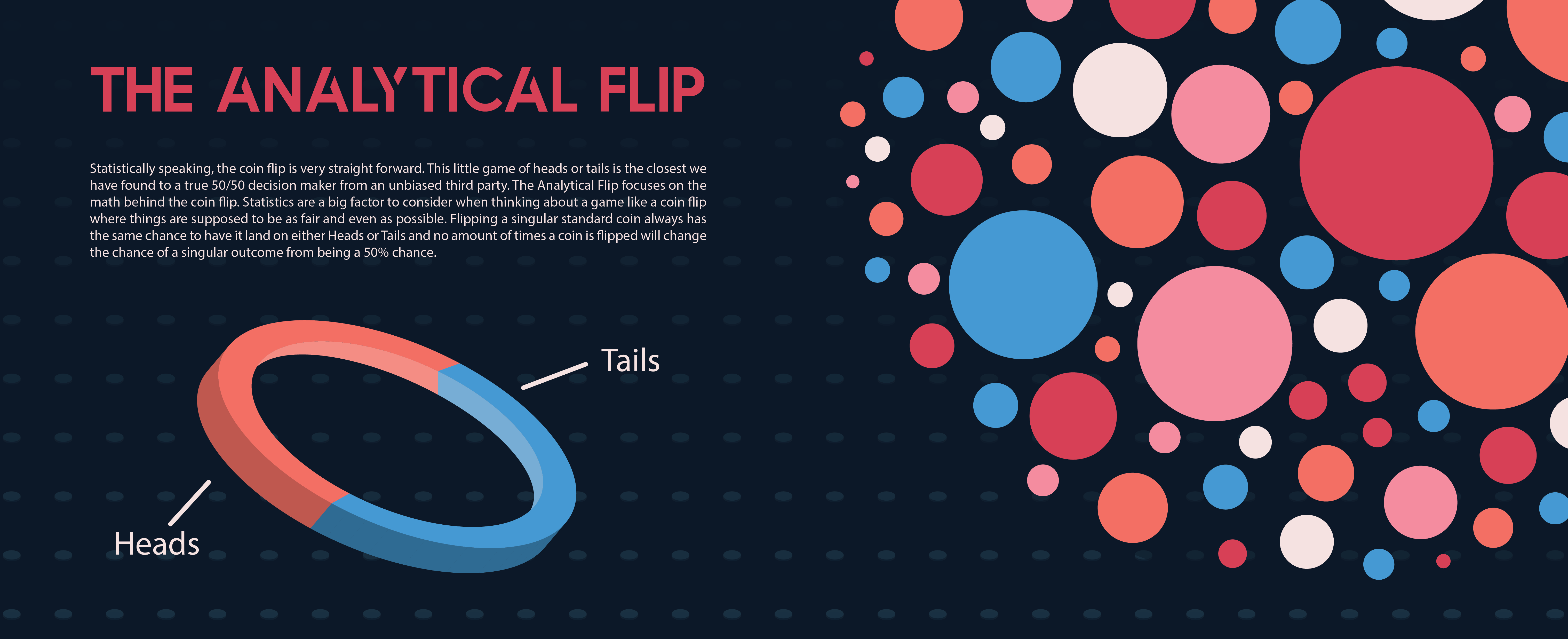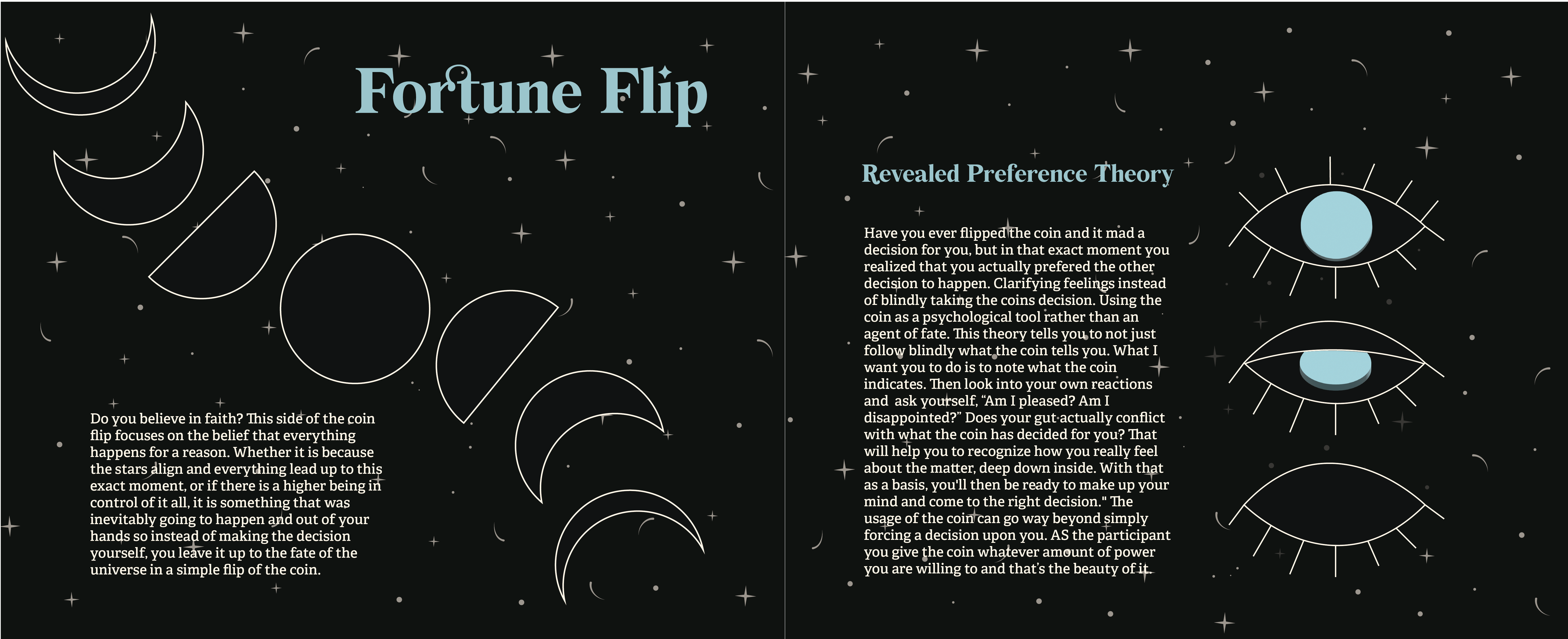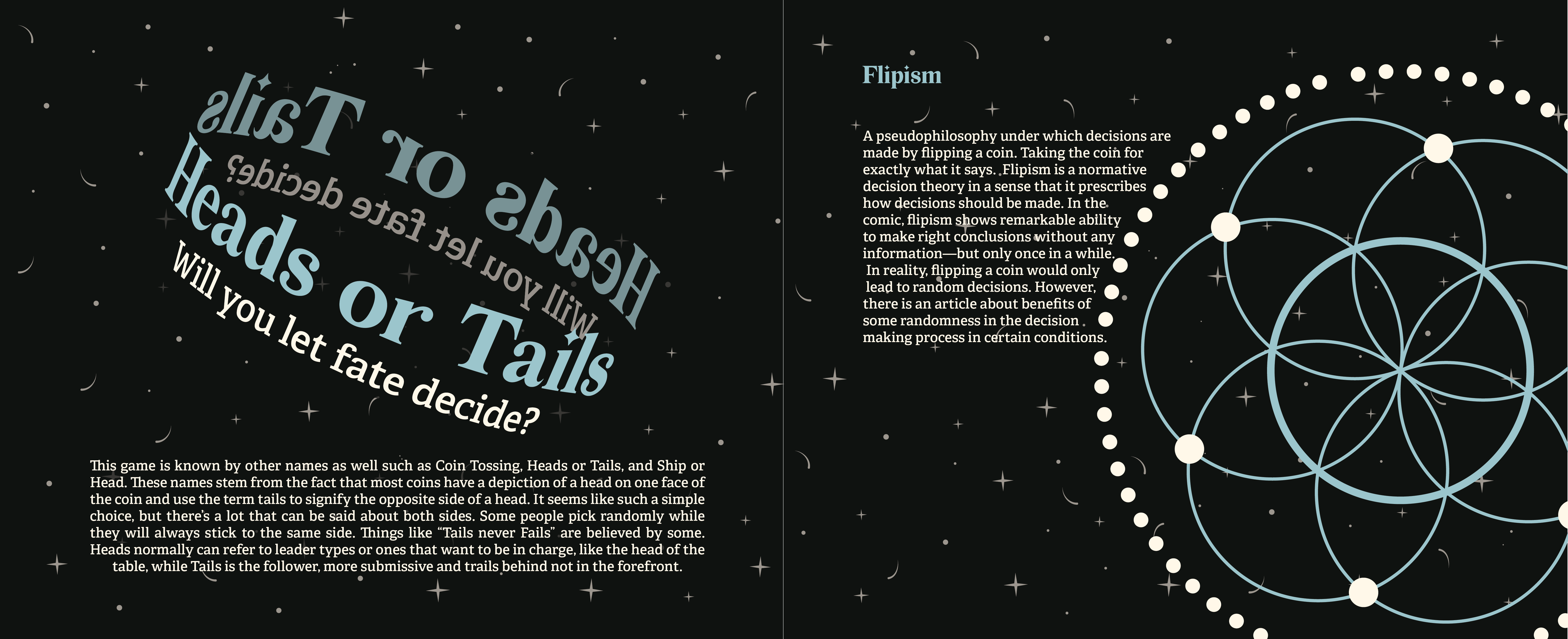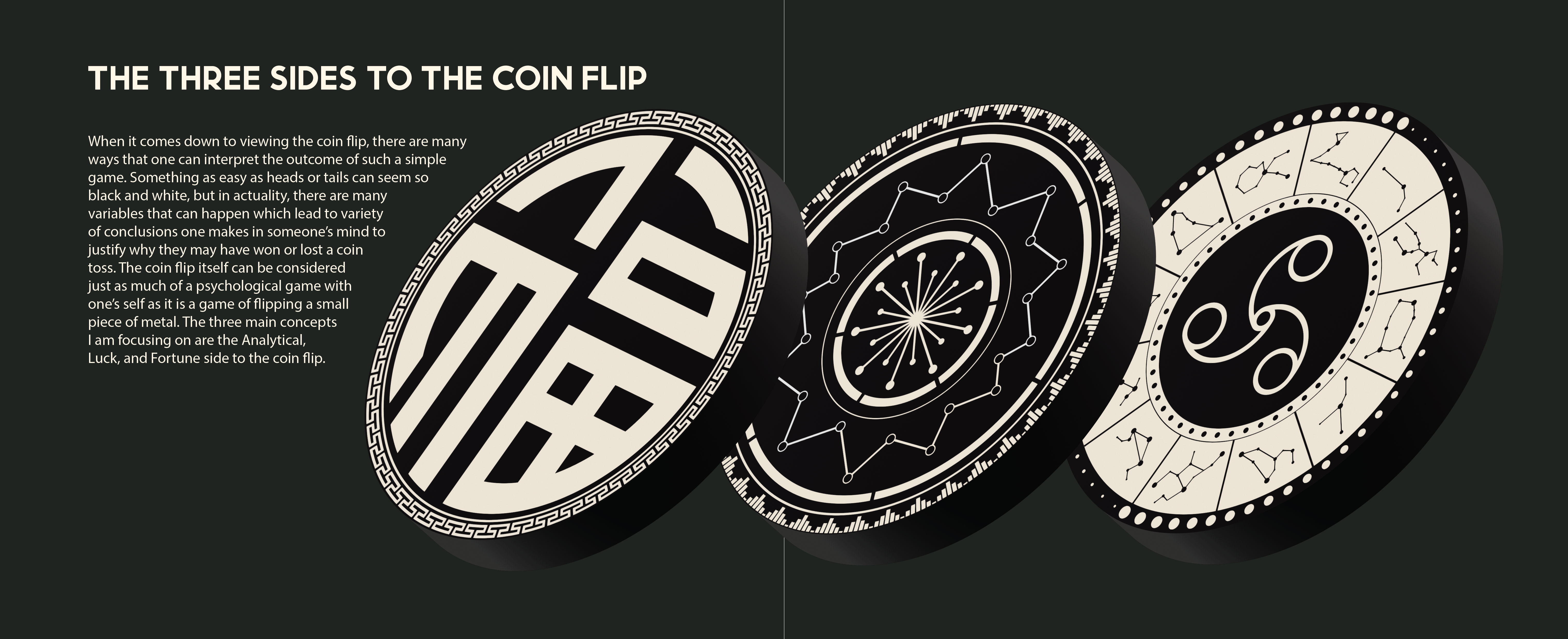 For my project thesis I focused on the aspect of a coin flip. This little game can be considered one of the truest ways we have of a 50/50, and I wanted to focus on designing what I consider the different mindsets for the usage of flipping a coin. The different ways a coin flip can help us understand a decision or settle a dispute, and how it can be used to possibly impact the direction of our lives.