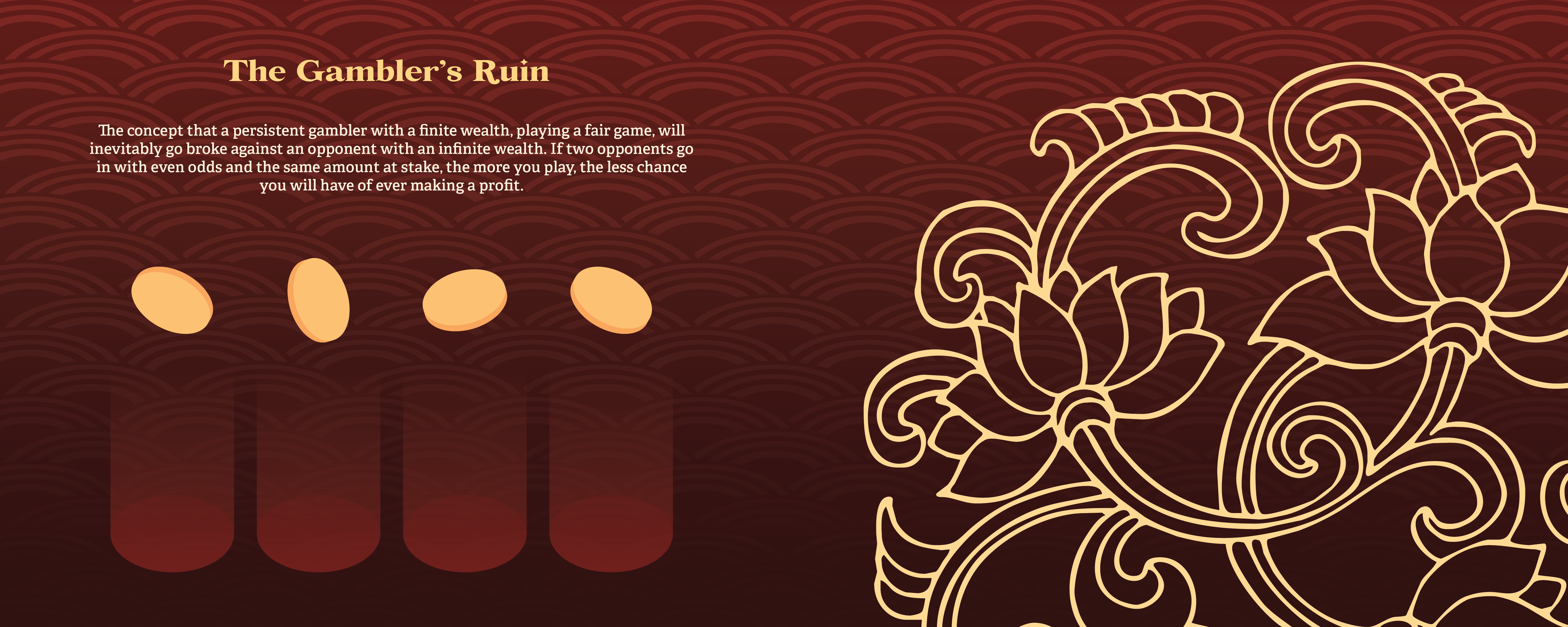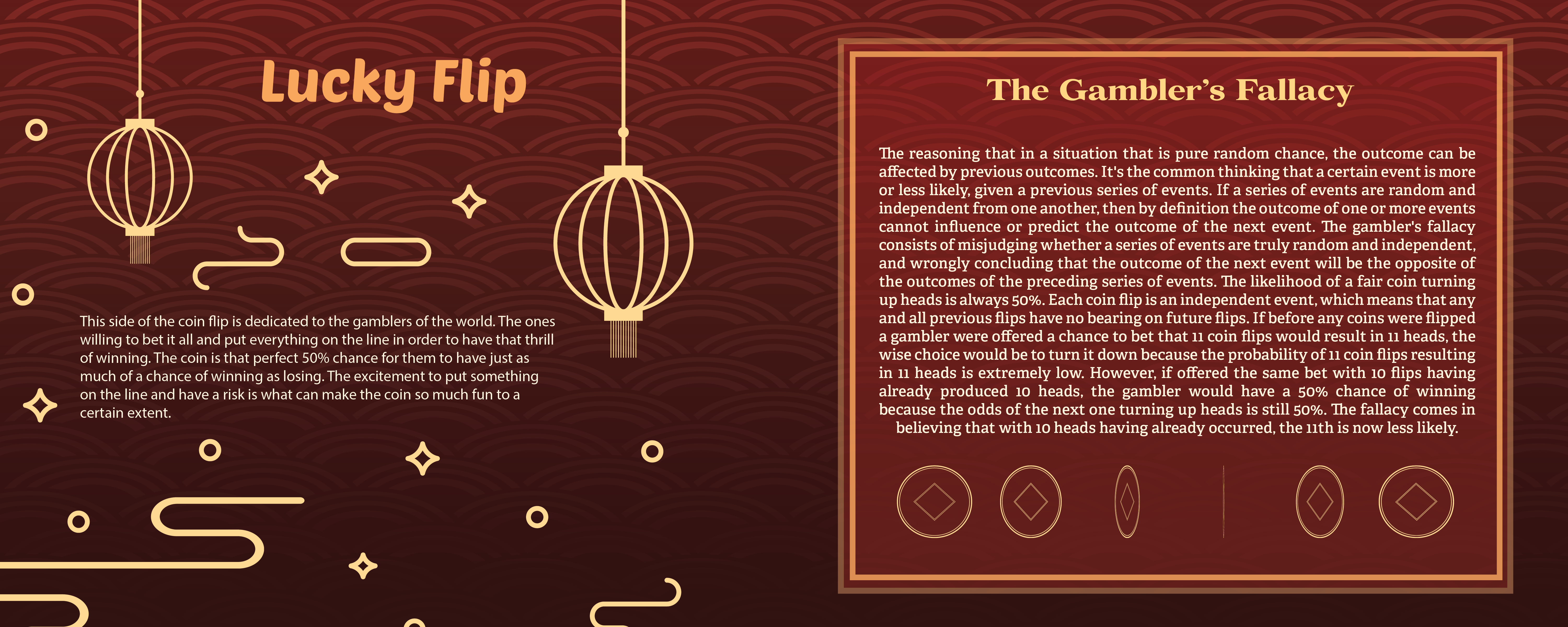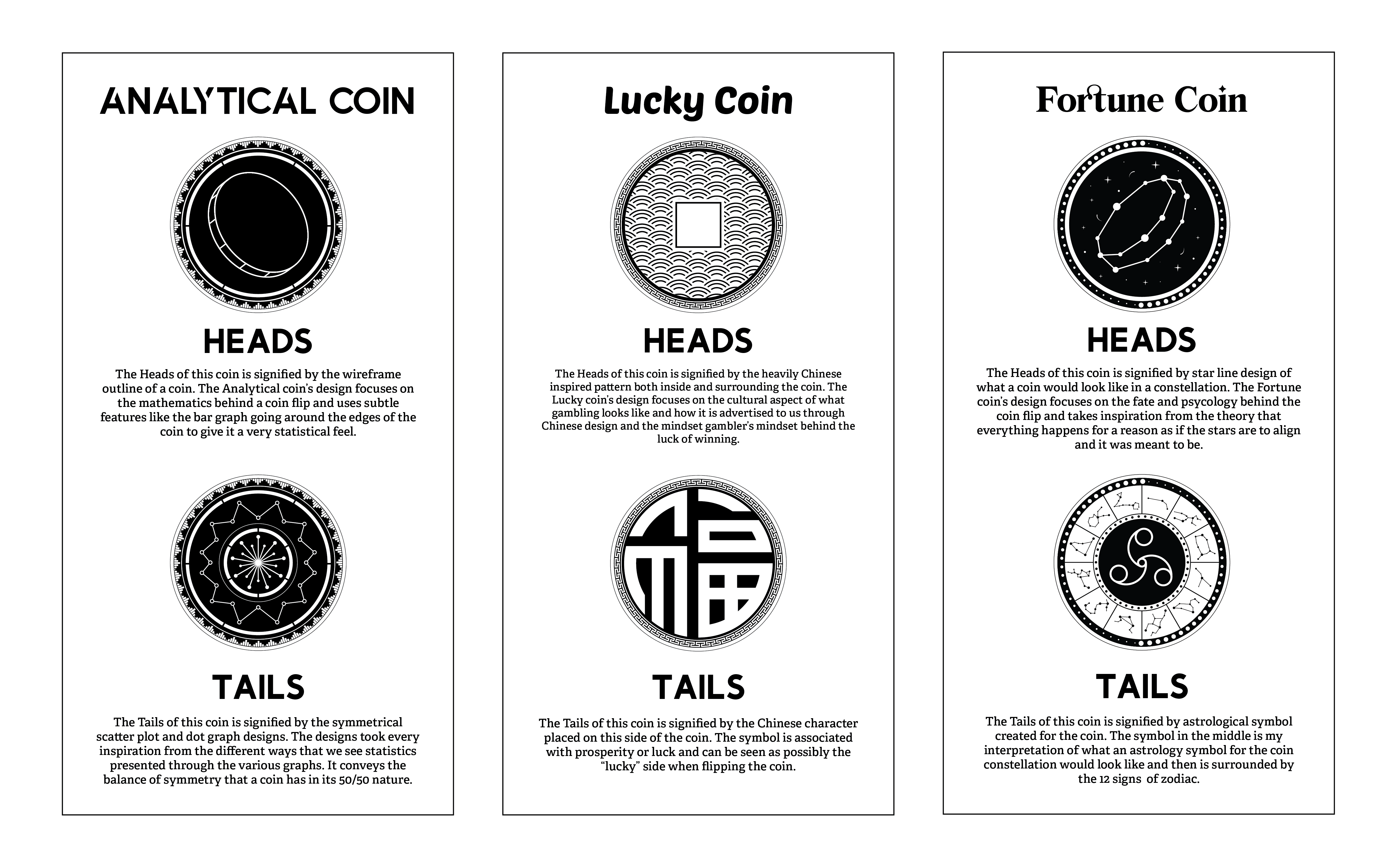The way I see it, the coin flip could be broken down into 3 sides which I wanted to focus more on and design elements for each one of those mentalities. The Analytical side for those that are more interested in the physics and mathematics behind the coin and how accurate this device that we consider a 50/50 really is. The Lucky side for the gambler's that love the thrill of risking something and having no control over the outcome but having the luck to win it all even if the odds aren't necessarily in their favor. The Fortune side for the ones who believe that everything happens for a reason. That at the end of the day, you have no control over the decision because everything happens for a reason and everything that is meant to happen will work out and happen at the end of it all, as if the stars will always align.
