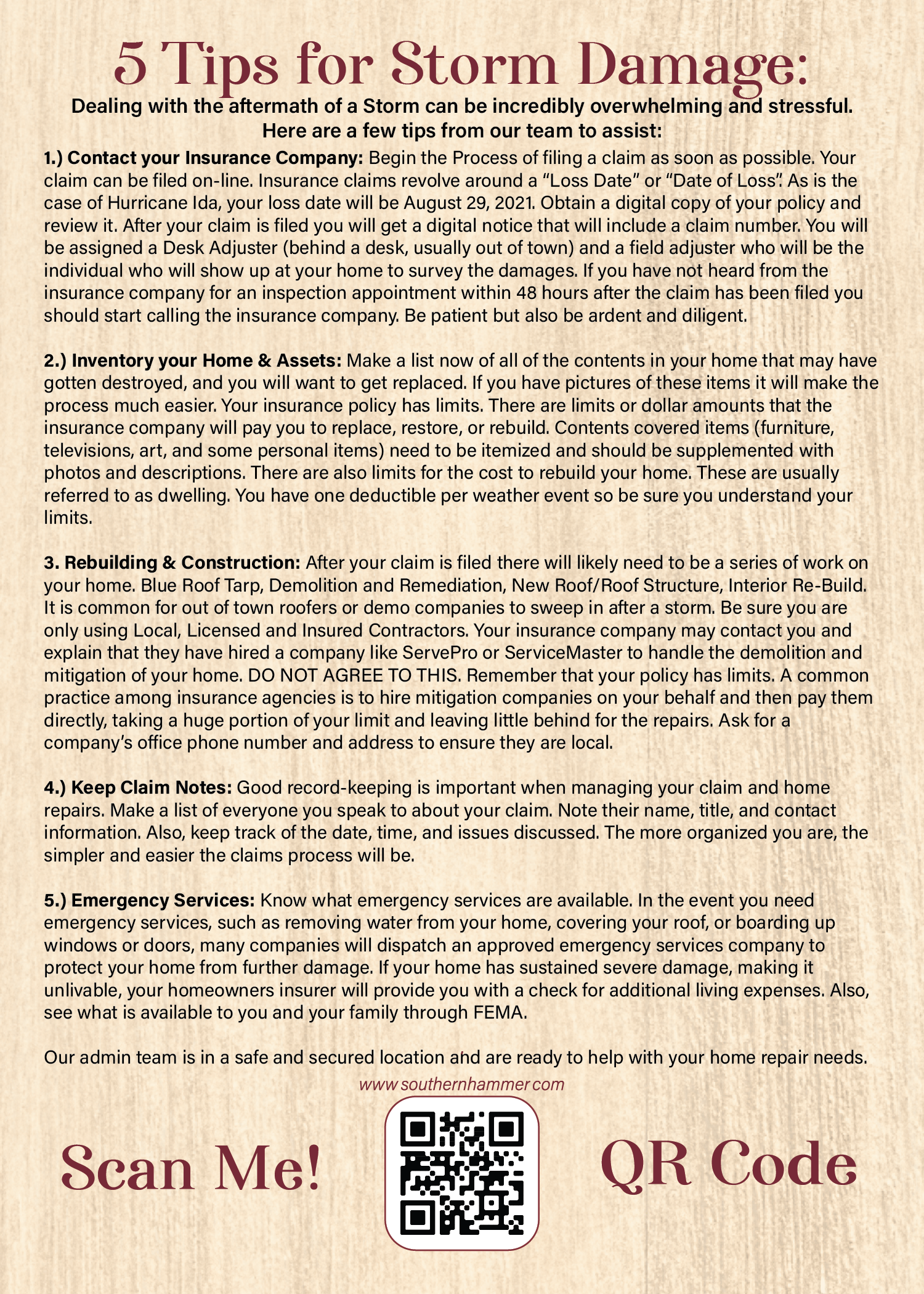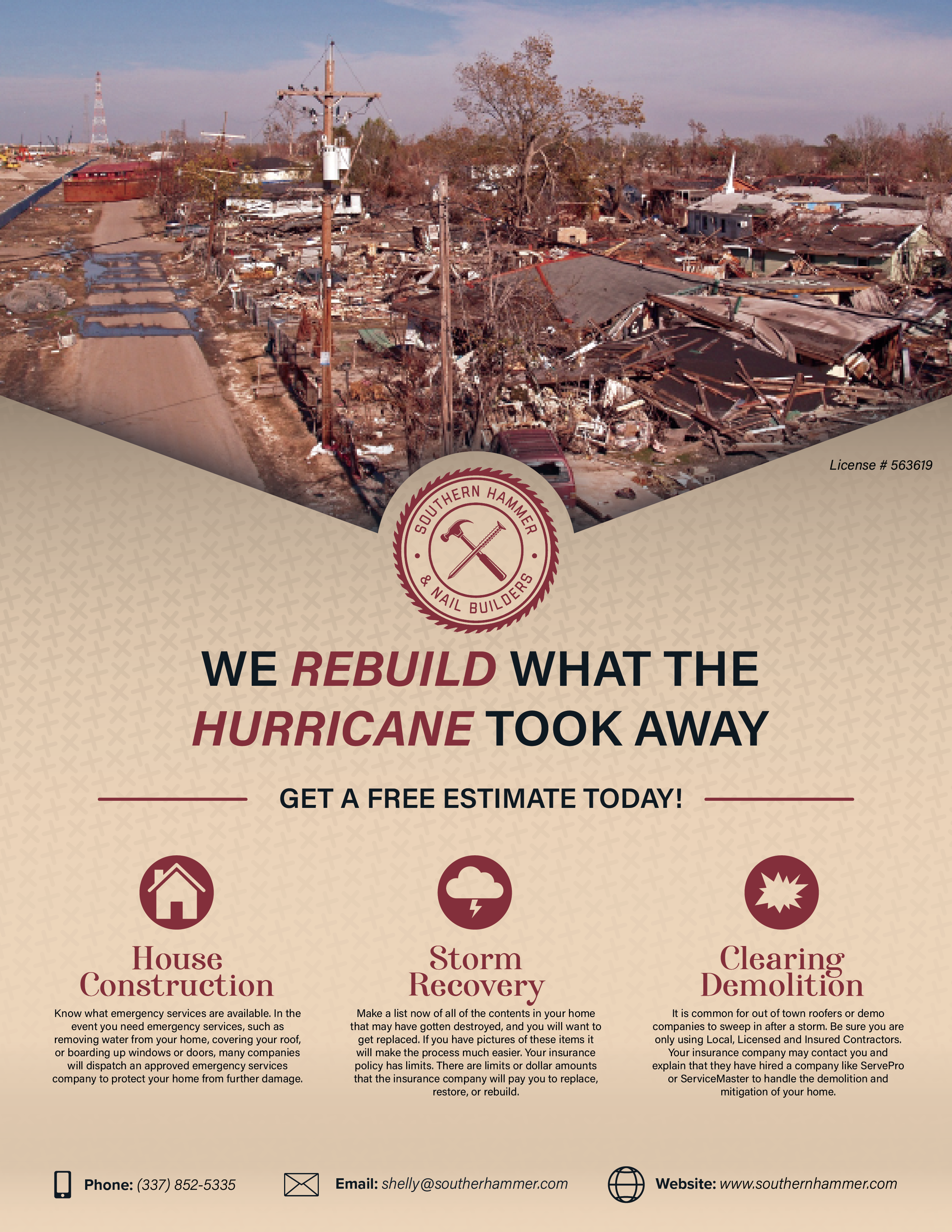 This was a difficult time for the people of Louisiana as the major hurricane Ida had just recently touchdown and left a lot of residents needing construction and aid. Southern Hammer & Nail wanted to get a jump on the competition helping the community while also assuring them with quality, trusted labor. I was tasked by them to create business cards, posters, and flyers to help inform people of what procedures they should take in order to restore their homes.